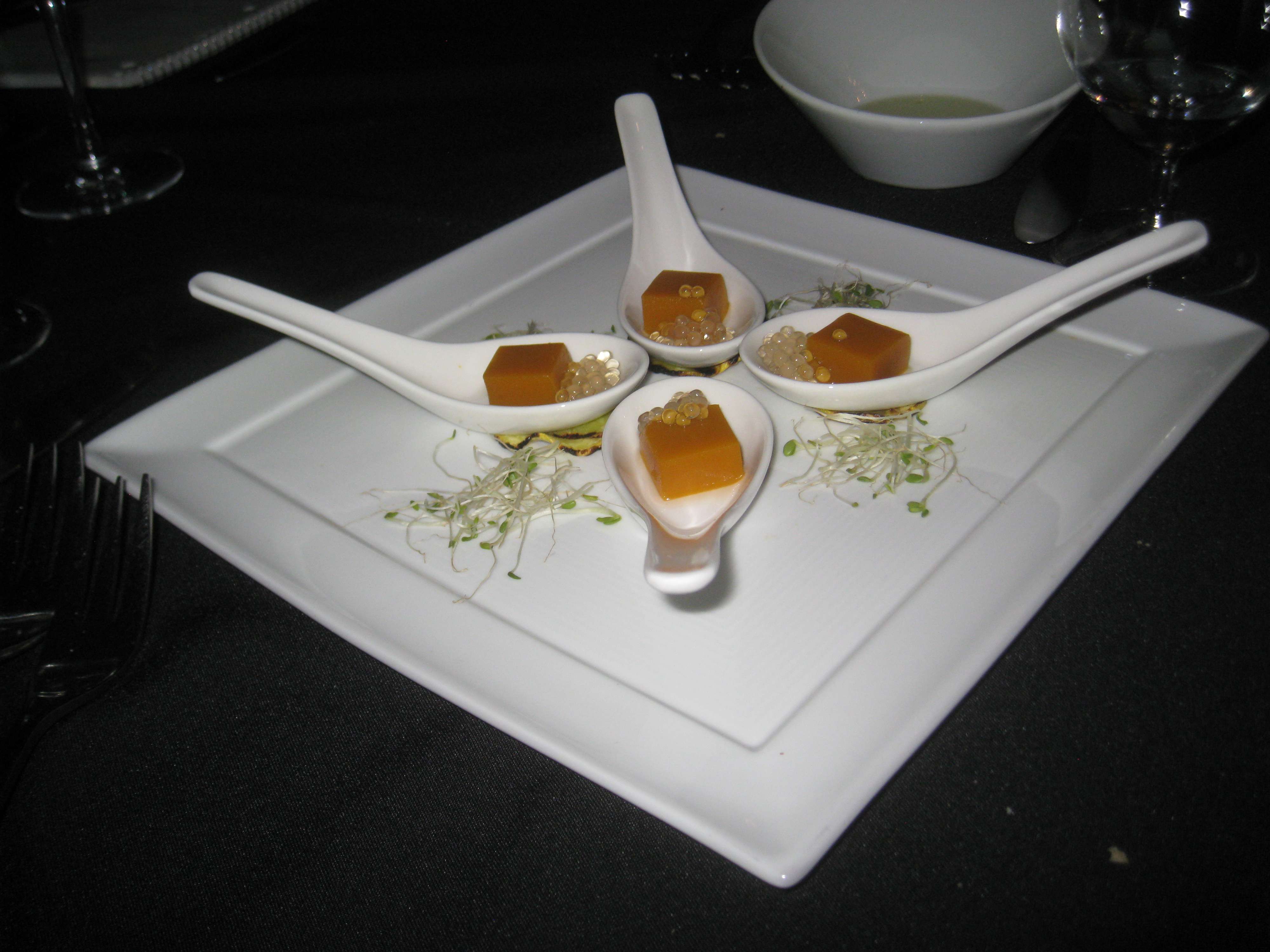 Around the same time as the Amuse Bouche was being passed out, Jonathan Hajdu, the associate wine maker and on-site kosher supervisor was pouring out the first of the four wines that we would be tasting this evening; the 2008 Covenant Lavan Chardonnay. When I tasted it earlier this year at the 2010 Herzog Food and Wine Festival in Oxnard, it actually showed more ripe fruit and tannin – from the oak. It was still young then and crazy fun. Now when we tasted it, the wine seems to be hitting its stride. The tannin is gone or covered over with a blanket of toasty rich oak and butterscotch, along with a bit of fruit. Clearly this is a bottle that is ready to party and one that really was not meant to pair with the Amuse Bouche, but heck it was there so we tasted it. Again, the gel cube barely survived the oak attack, while the poor apple caviar was gutted from the inside out, never had a chance. Again to be fair, it was not a real pairing, but we tried for the fun of it.