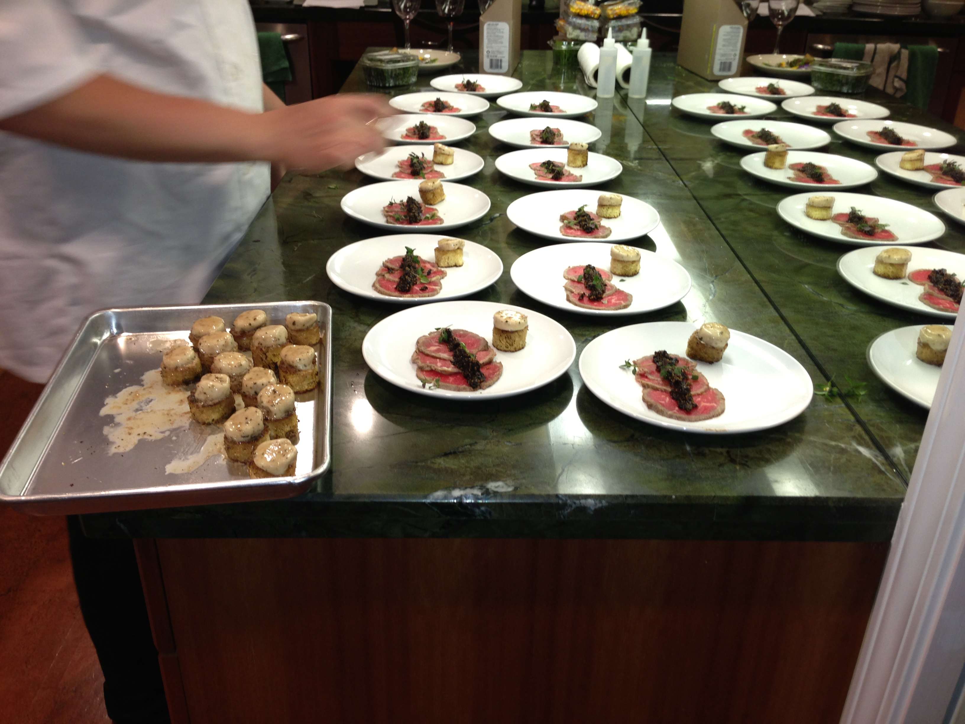 Setting the plates of Beef Carpaccio, Cherry Mostarda, Marrow Toast