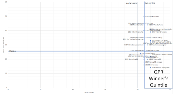 A graph of the QPR Winners and high scored wines for the simple white wine category Median Price keeps moving and more wines are Winners