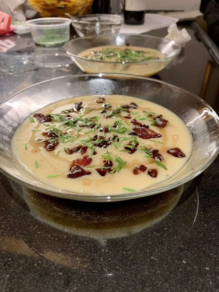 Creamy Potato Soup, Crispy Lamb Bacon, Chives